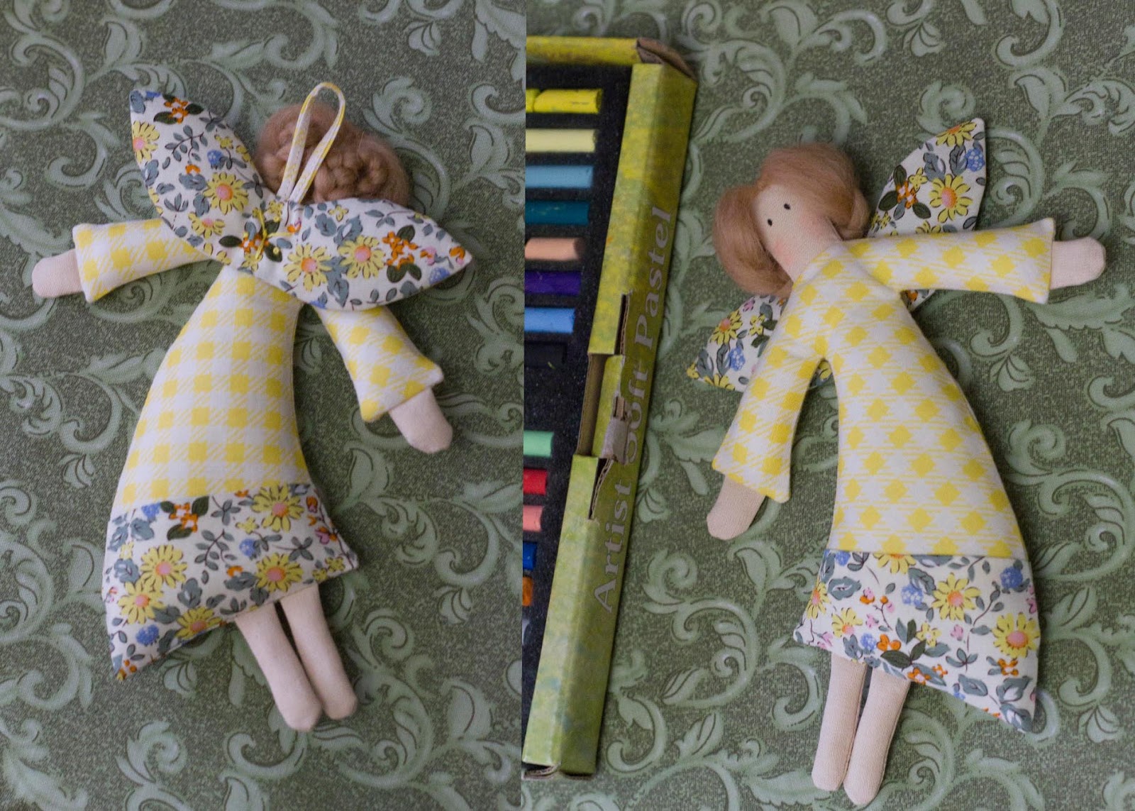 Осталось сделать личико - я нарисовала на сей раз точки акриловыми красками, на прошлых ангелах пришивала бисеринки. Щечки рисуем пастелью (или румянами, но они хуже держатся), я натираю мелком палец и пальцем наношу щечки. Вот, что у нас получилось: