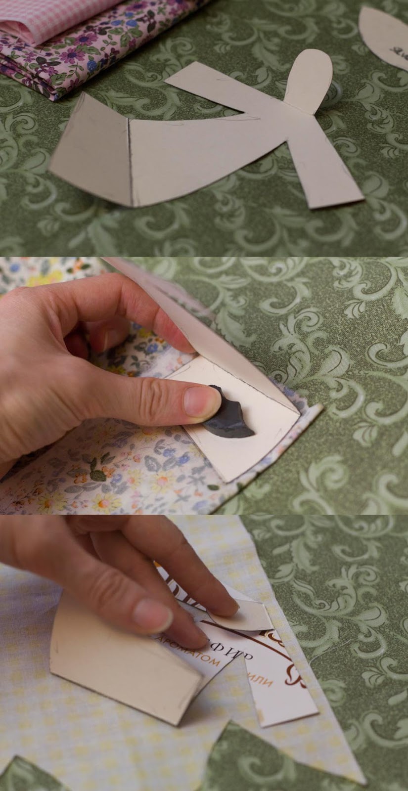 Выкройку я распечатала на лист А4 и наклеила на картон, затем вырезала по контуру. Там, где планируется разрезать выкройку на составные части (тело ангела делится на голову и две части платья), я прочертила канц.ножом, чтобы части просто загибались. Для меня это удобно тем, что мелкие части не будут разбегаться и не ломать каждый раз голову, что к чему какой стороной приставить-пришить. Это выглядит так: