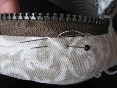 Подкладку косметички с карманами вставляем внутрь и подшиваем потайными стежками к молнии. Совмещение контрольных точек обязательно! Но бывает, что подкладку нужно подгонять по размеру. Как не пыталась я корректировать выкройку, все равно получается по-разному. Пришла к выводу, что при использовании разных материалов (толще-тоньше) и слоя синтепона, размеры меняются.