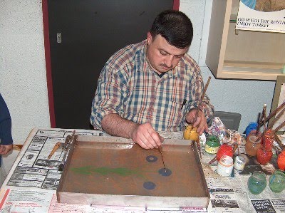 Для первого этапа в небольшое прямоугольное корыто выливается специально приготовленный густой раствор из воды и имеющего слабые клеящие свойства нектара гевена (это растение из рода астрагалов растет только в Турции). Таким образом достигается необходимая вязкость воды. Далее в эту смесь добавляют натуральные краски, которые не растворяются в воде, а остаются на её поверхности, смешиваются между собой и образуют причудливые и неповторимые узоры.