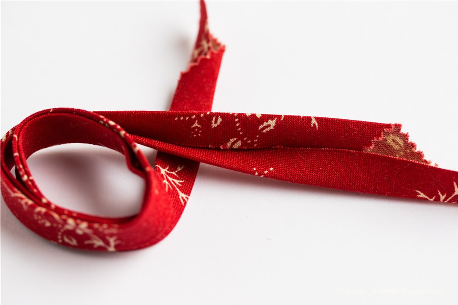 Складываем «пирог»: задник — флизелин — звезда и окантовываем бейкой, прокладывая мелкие наметочные стежки и следя за тем, чтобы край бейки проходил точно по начерченной линии и с лицевой и с задней стороны.