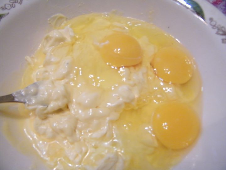 И так: 1 пачку размягченного маргарина взбить с 3 яйцами и чайной ложкой (с горкой) соли