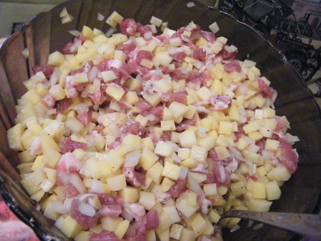 Начинка классическая - мясо, лук, картошка, соль, перец.