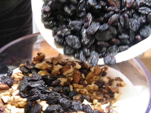 Во взбитые белки положить очищенный, промытый и подсушенный черный изюм (450-500гр) и измельченные грецкие орехи (450-500гр), все смешать.
