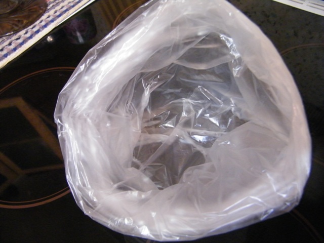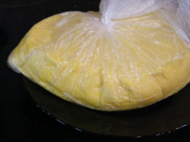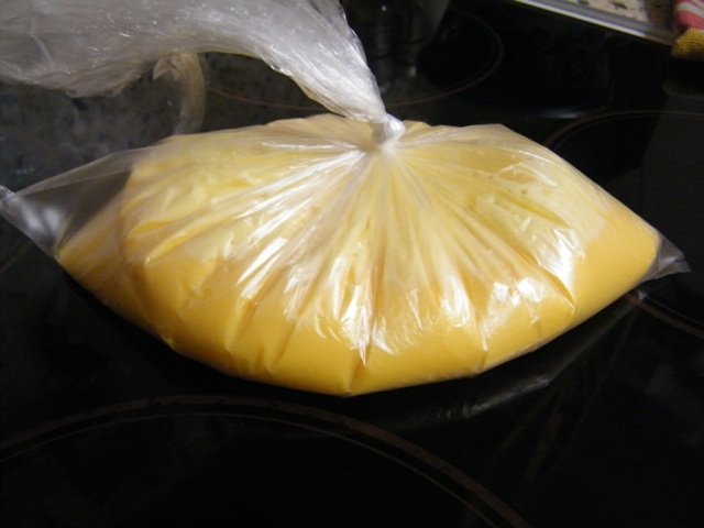 Два целлофановых пакета вложила один в другой и вылила туда омлетную массу, стараясь не оставлять много пространства завязала пакеты на узел