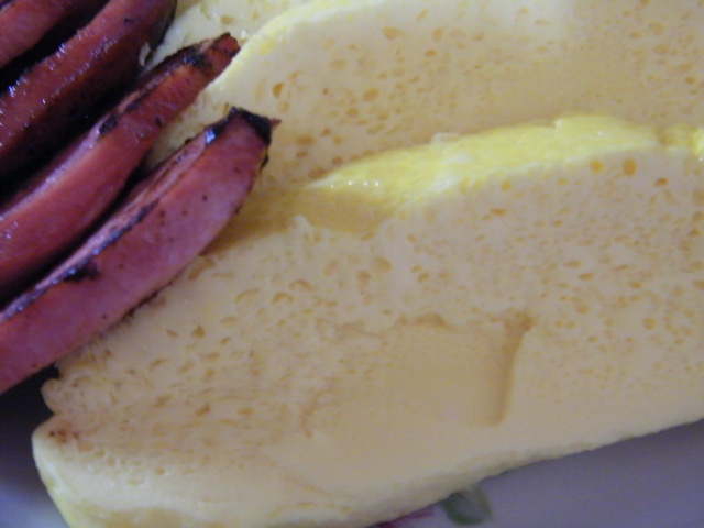 | От целлофана омлет отделился очень легко и лег на тарелку в виде яичного облака. Такой омлет всегда подавали на завтрак в советских санаториях и домах отдыха, у меня всегда возникал вопрос, а где же поджаренная корочка?! А вот! |