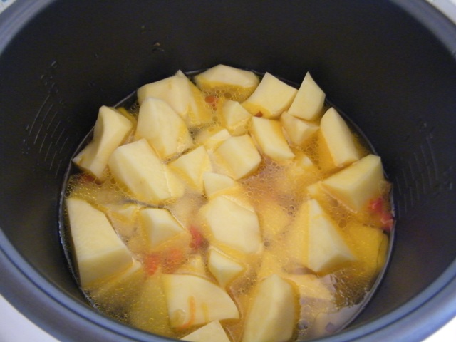 Чистим картошку, режем крупными дольками, отправляем к зажарке, солим, перчим, приправляем по вкусу и заливаем водой. Закрываем крышку, пусть готовится,