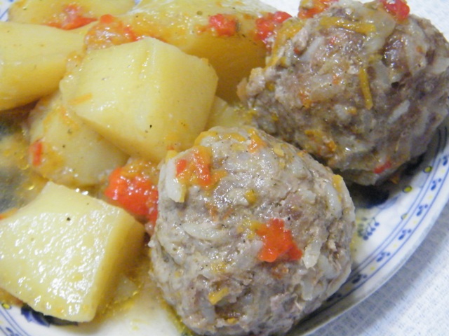 Выкладываем сверху картошки, я немного подлила водички, до середины тефтелей.
