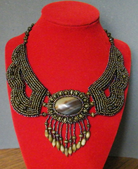 Кабошон яшмы цветочной, бусины кошачьего глаза и чешский бисер.
