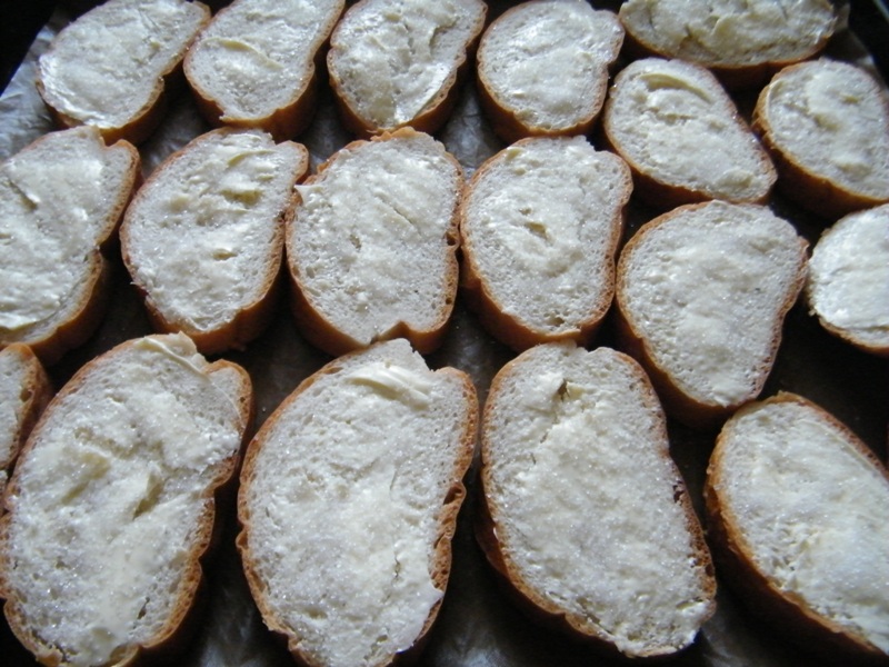 Берем обычный нарезной батон, режем на сегменты. Каждый кусочек смазываем сливочным маслом (без фанатизма) и посыпаем сахаром (в разумных пределах).