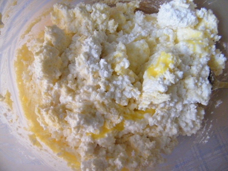 Добавить яйца, творог, сметану, соль и разрыхлитель.