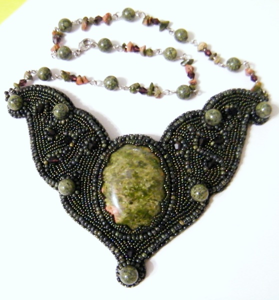 Унакит, камень-красавец, очень его люблю, хотя кпризуля он еще тот! Тяжело и со скрипом подбирает он себе бисер и по фактуре и по цвету...и все равно - он мой фаворит! Колье "Гармония":