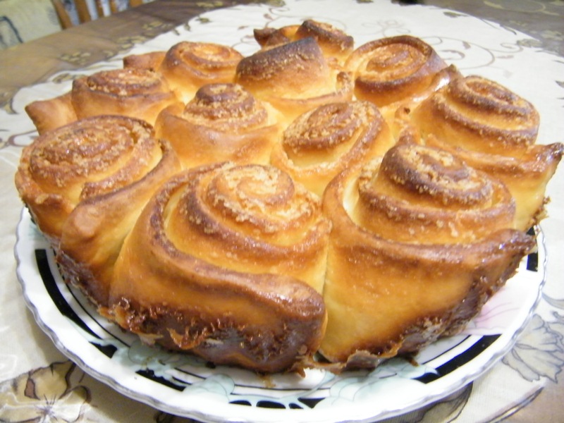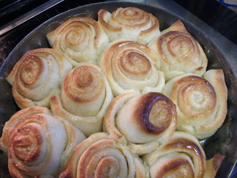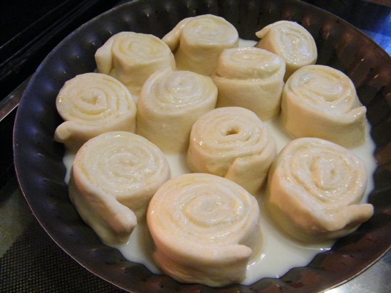 Молоко для заливки подогреть в микроволновке до очень теплого состояния и развести в нем сахар. Половиной этой порции залить поднявшиеся булочки и поставить их в горячую (190гр) духовку на 15 минут.