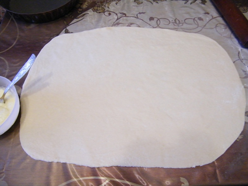 припылить стол мукой и раскатать все тесто в прямоугольник. Толщина теста 5мм.
