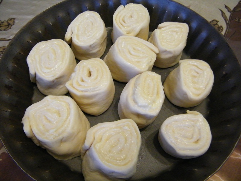 Свернуть рулетом, порезать на кусочки (5-6см) и выложить в форму на небольшом расстоянии друг от друга. У меня форма 26см - вошли все булочки.