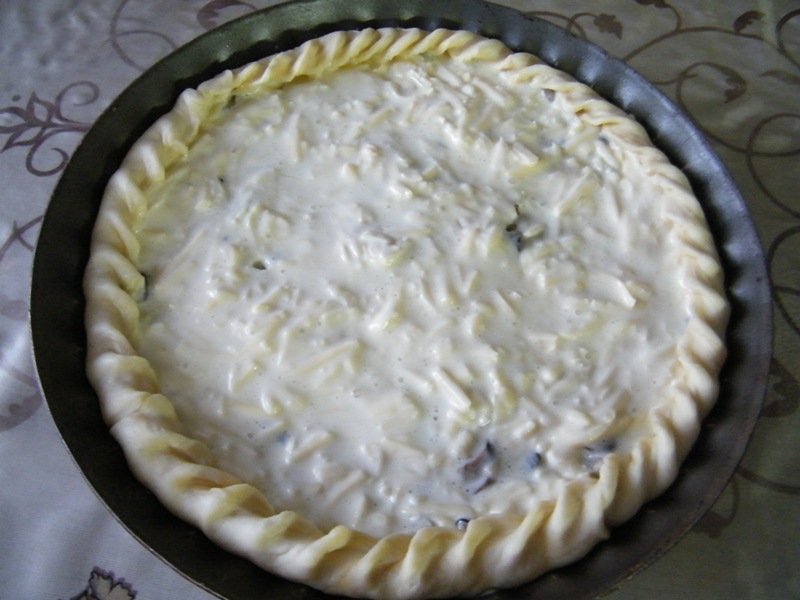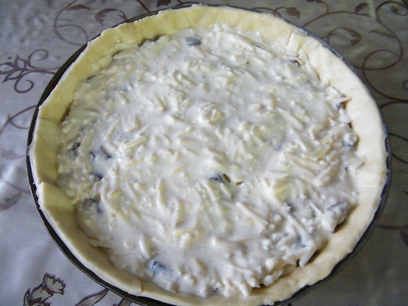 Начинку распределила по всему периметру))) Для заливки натерла сыр, разбила в него яйца и пару ложек майонеза.