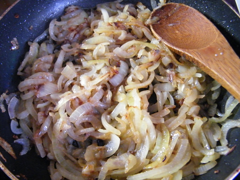 Лук пожарила отдельно, потом все перемешала. Тесто раскатала и застелила им форму.