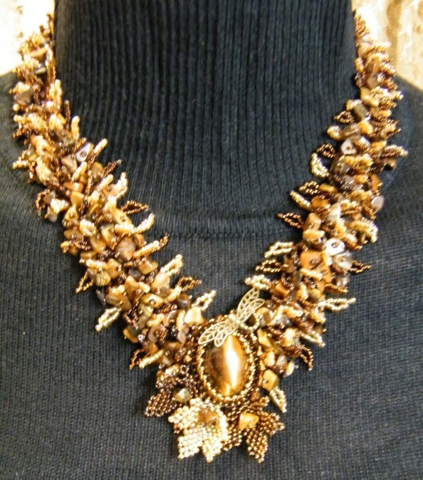 Расшитая сколами тигрового глаза и бисерными листиками сетка-уголок.