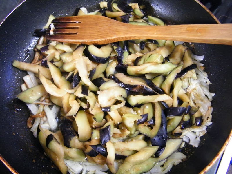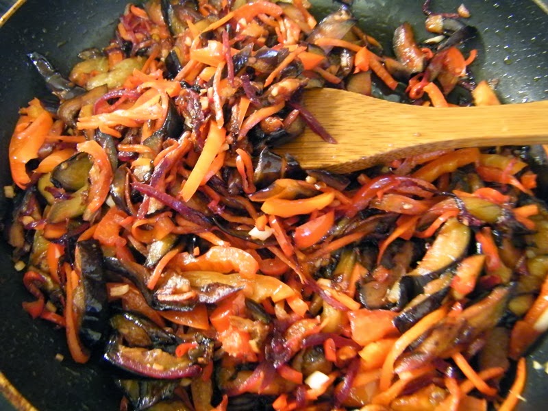 В раскаленном растительном масле обжарить лук до золотистого цвета. Баклажаны сильно отжать от жидкости и добавить к луку, хорошо перемешать.