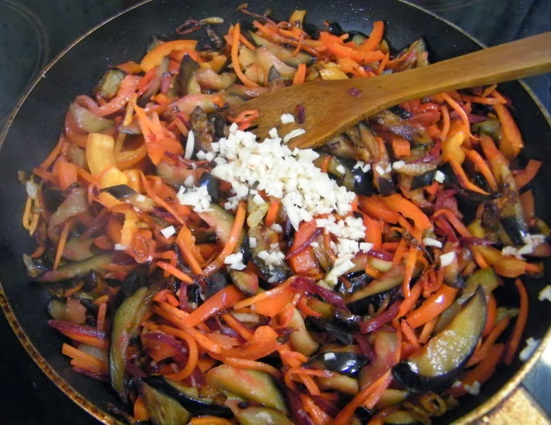 Опять все мешаем и добавляем мелко нарезанный чеснок.