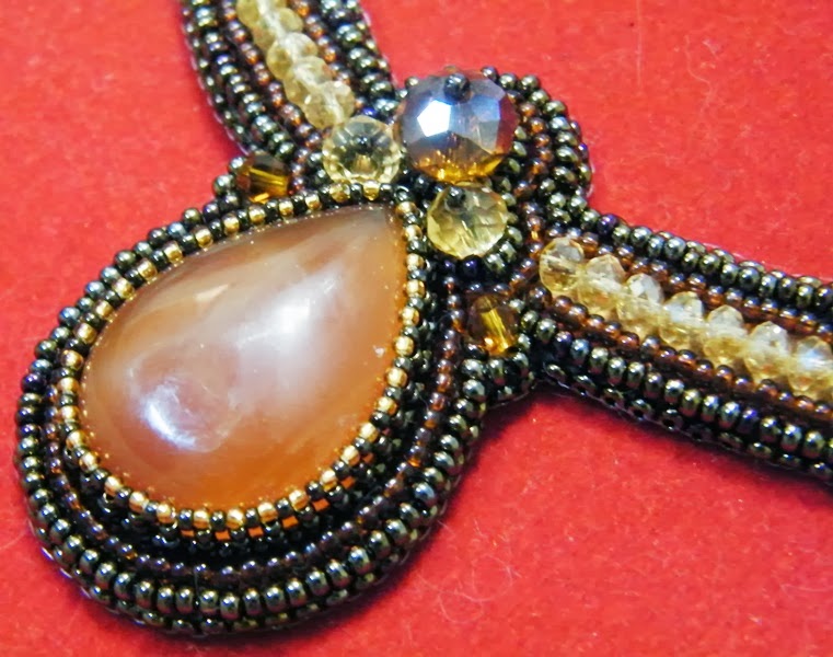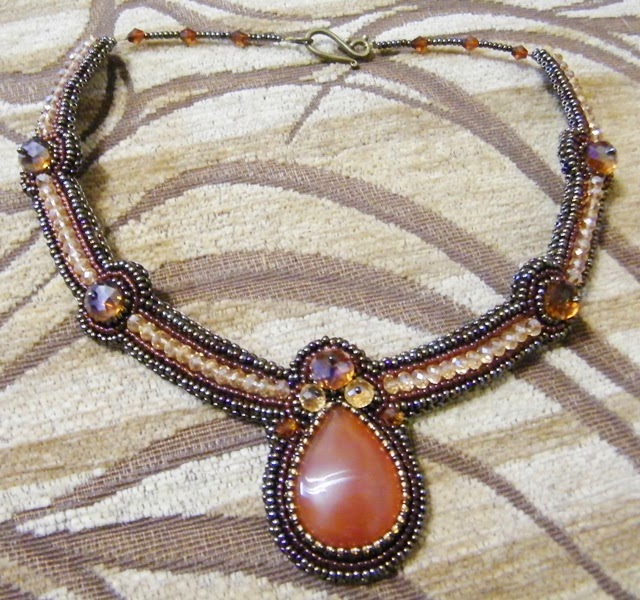 Как много интересных МК есть на бисерных ресурсах интернета! Хвала мастерам, которые делятся совершенно бескорыстно своими умениями и вдохновляют таких, как я на освоение нового в любимом бисероплетении. Колье-полустойка вышито японским и чешским бисером, гранеными бусинами, кабошон сердолик.