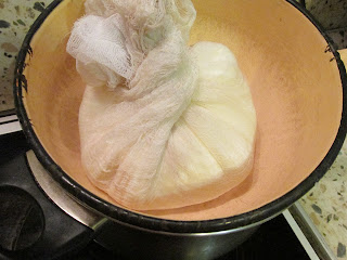 Дуршлаг поставить на кастрюлю, выложить дно марлей (в четыре слоя)