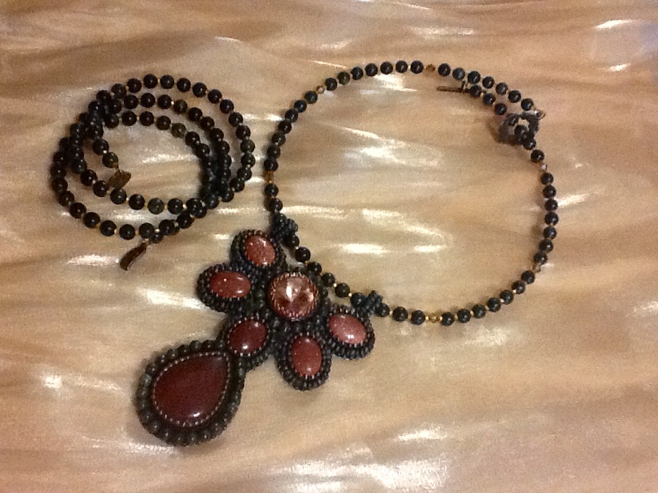 Кулон с родонитом и жемчугом. Нелегко мне дается асимметрия)))