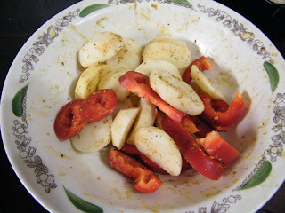 Оставшуюся картошку я посыпала солью, перцем, специями, порезала болгарский перец, перемешала
