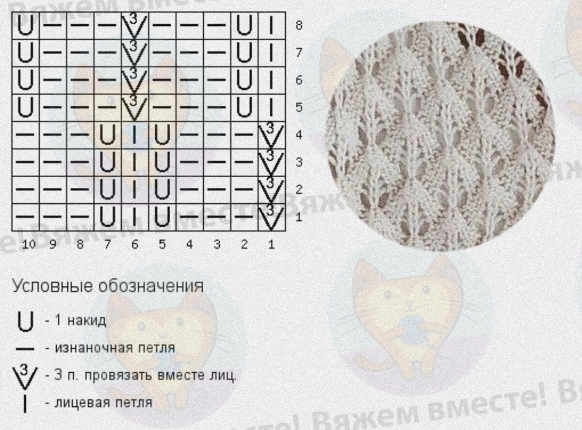 Сложность данного узора заключается в выполнении накидов и убавлений в каждом ряду узора. Если при вязании по кругу провязывать три петли вместе, оставляя центральную сверху, не так уж и сложно, то при вязании поворотными рядами могут появиться трудности.