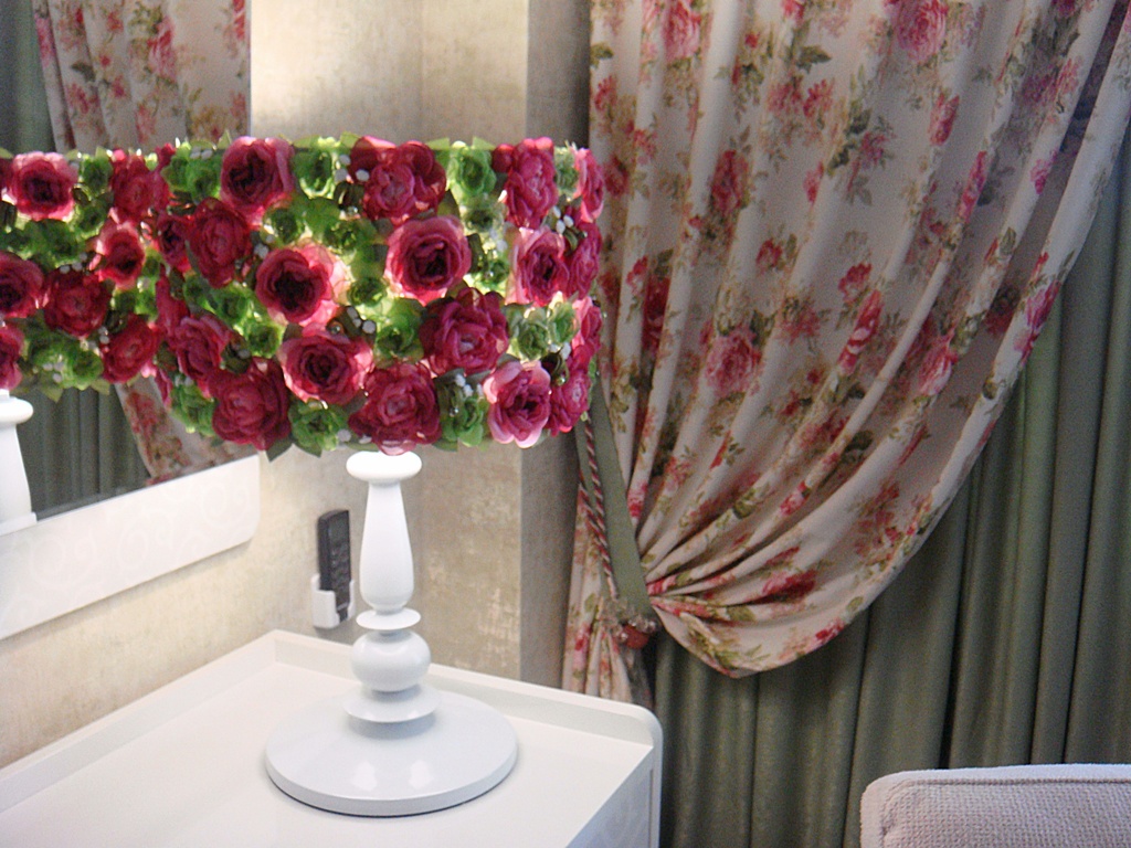 Я подбирала для изготовления цветов ткани, подходящие по цвету к текстильному оформлению спальни дочки. И так как абажур одной лампы уже был заменен мной полностью...