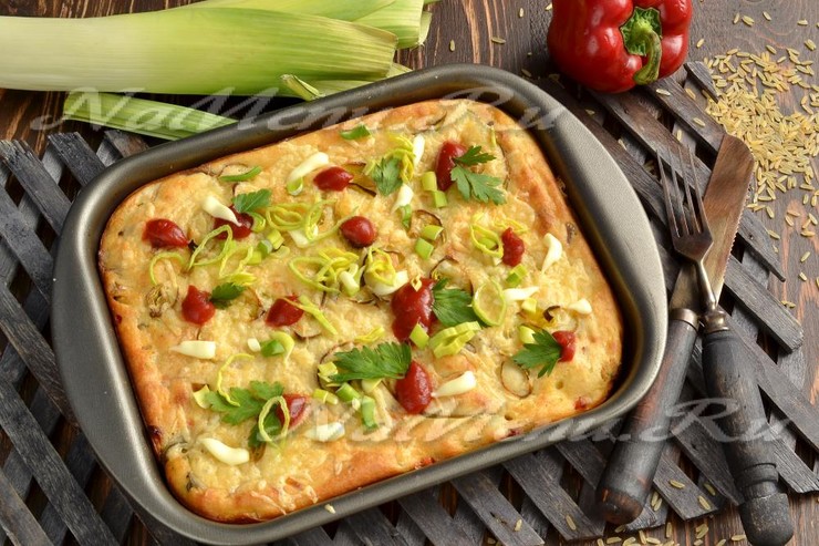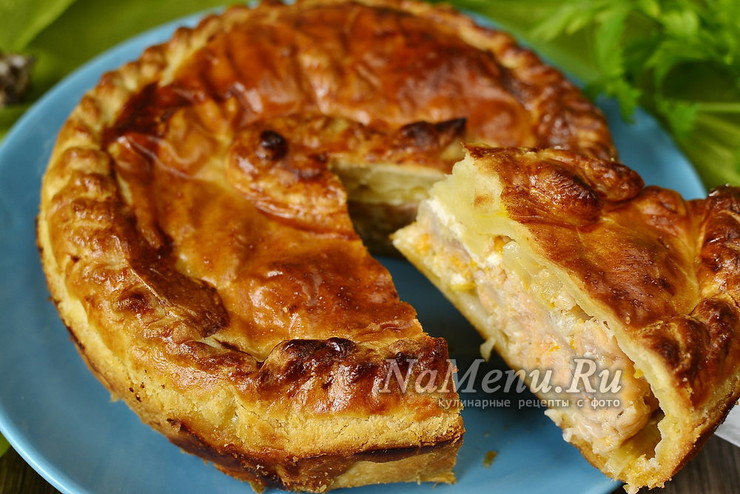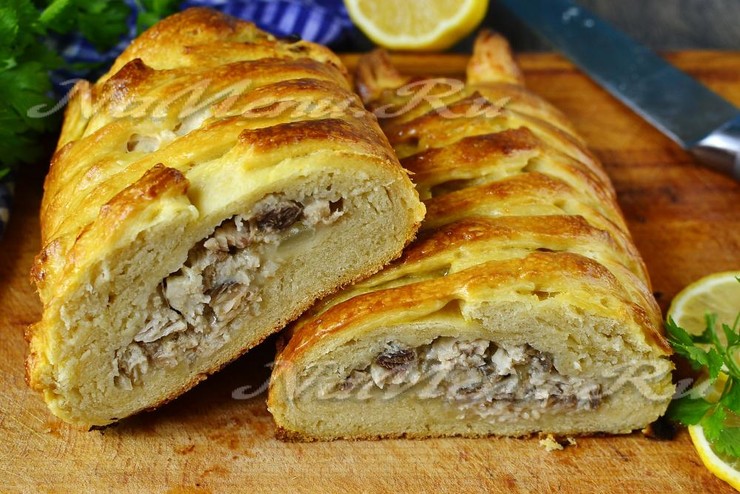 Для начинки этого пирога предлагаем взять, помимо самой рыбы, немного грибов, риса и зеленого лука. Готовый пирог сразит наповал всех ваших гостей!