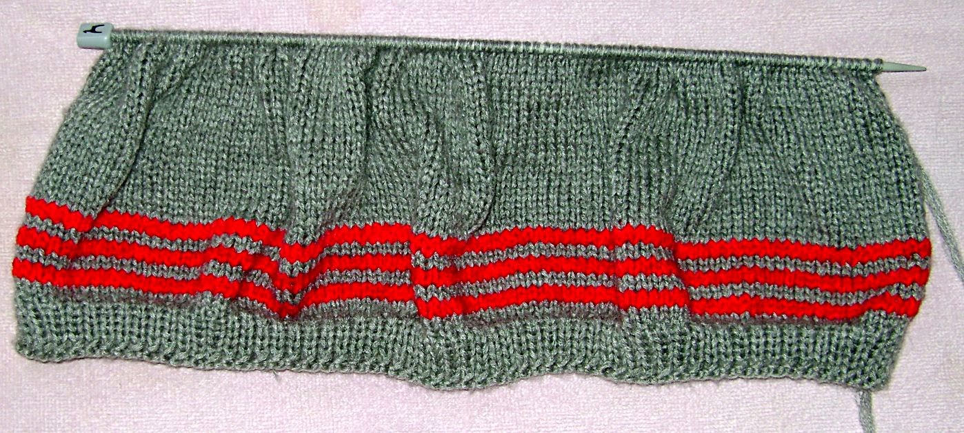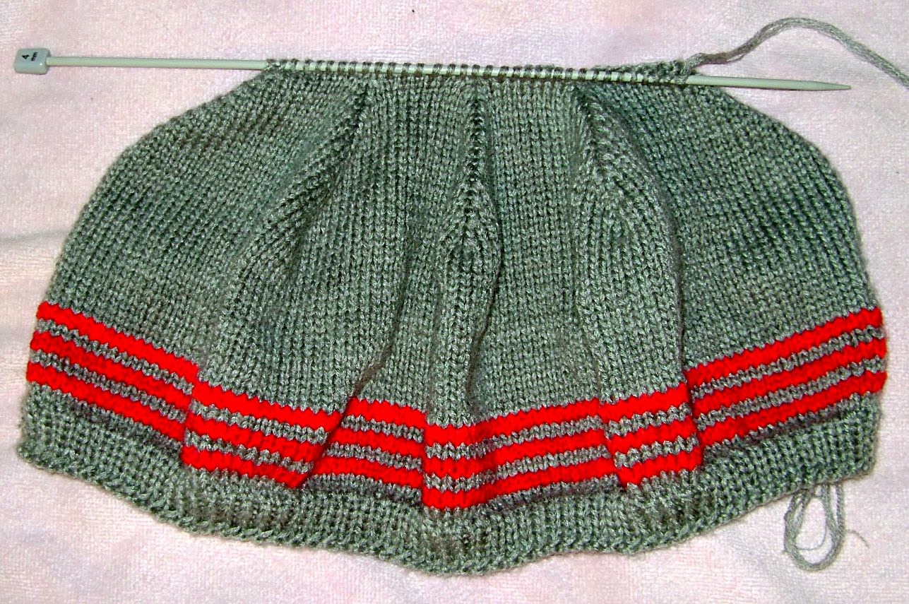 Вот уж стало холодать. Слегка утеплила старшего ребёнка. Цвет ниточек подбирался в тон осенней куртки. Серая ниточка идёт в восемь сложений, красные полосочки – в два. Состав пряжи мне не известен, скорее всего, смесовая, с каким-то процентом шерсти. Спицы №4.
