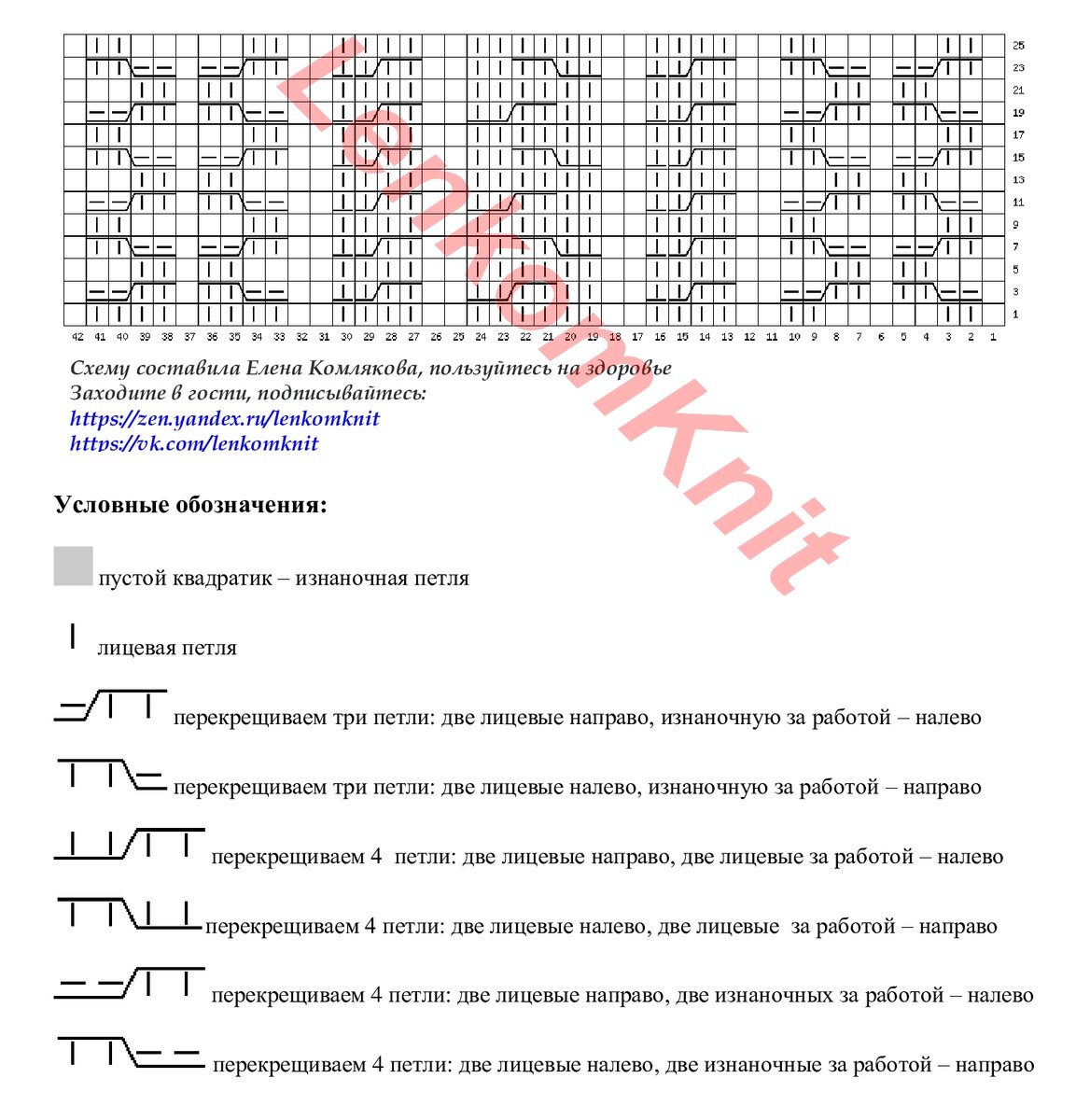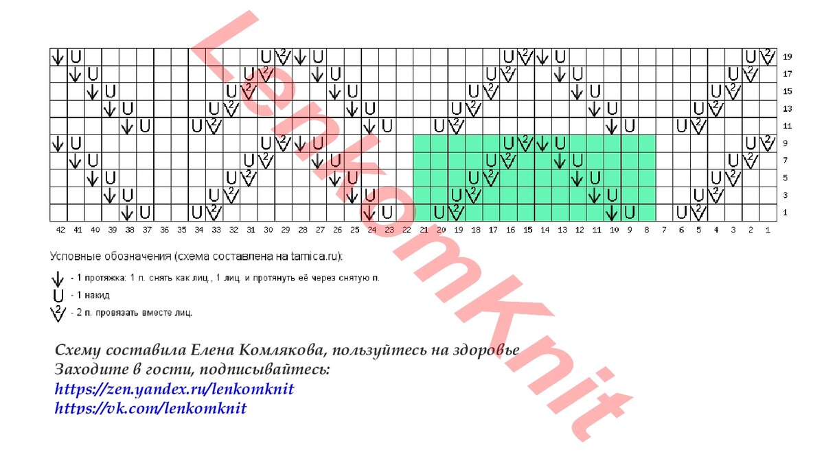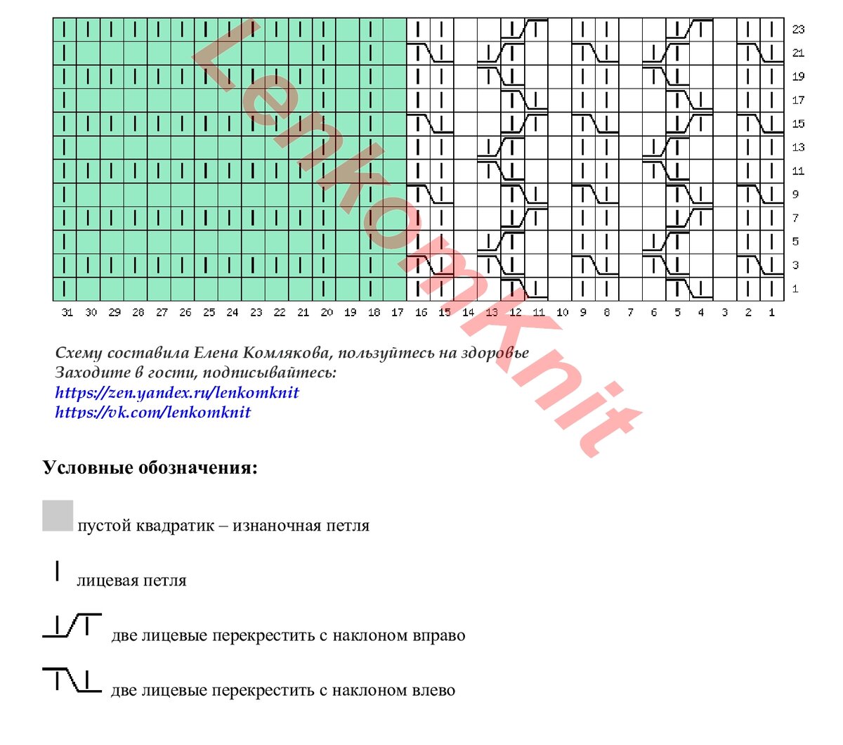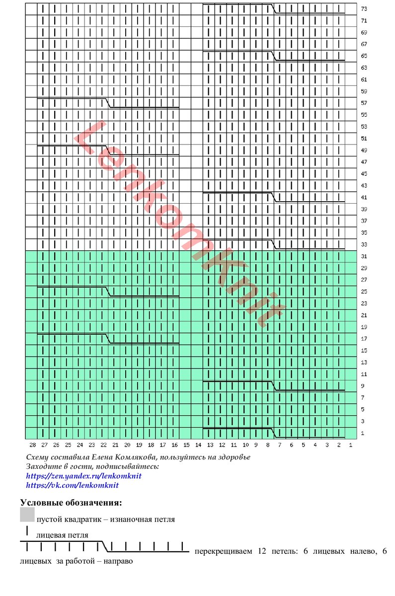 На рисунке - схема узора (зеленым цветом выделен раппорт), там настоящие косы. Но я бы их связала ложными, чтобы не было лишнего объема и сэкономить пряжу. Да и тактильно ложные косы значительно приятнее, чем обычные.