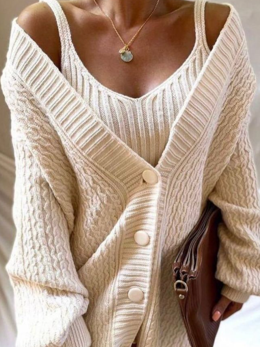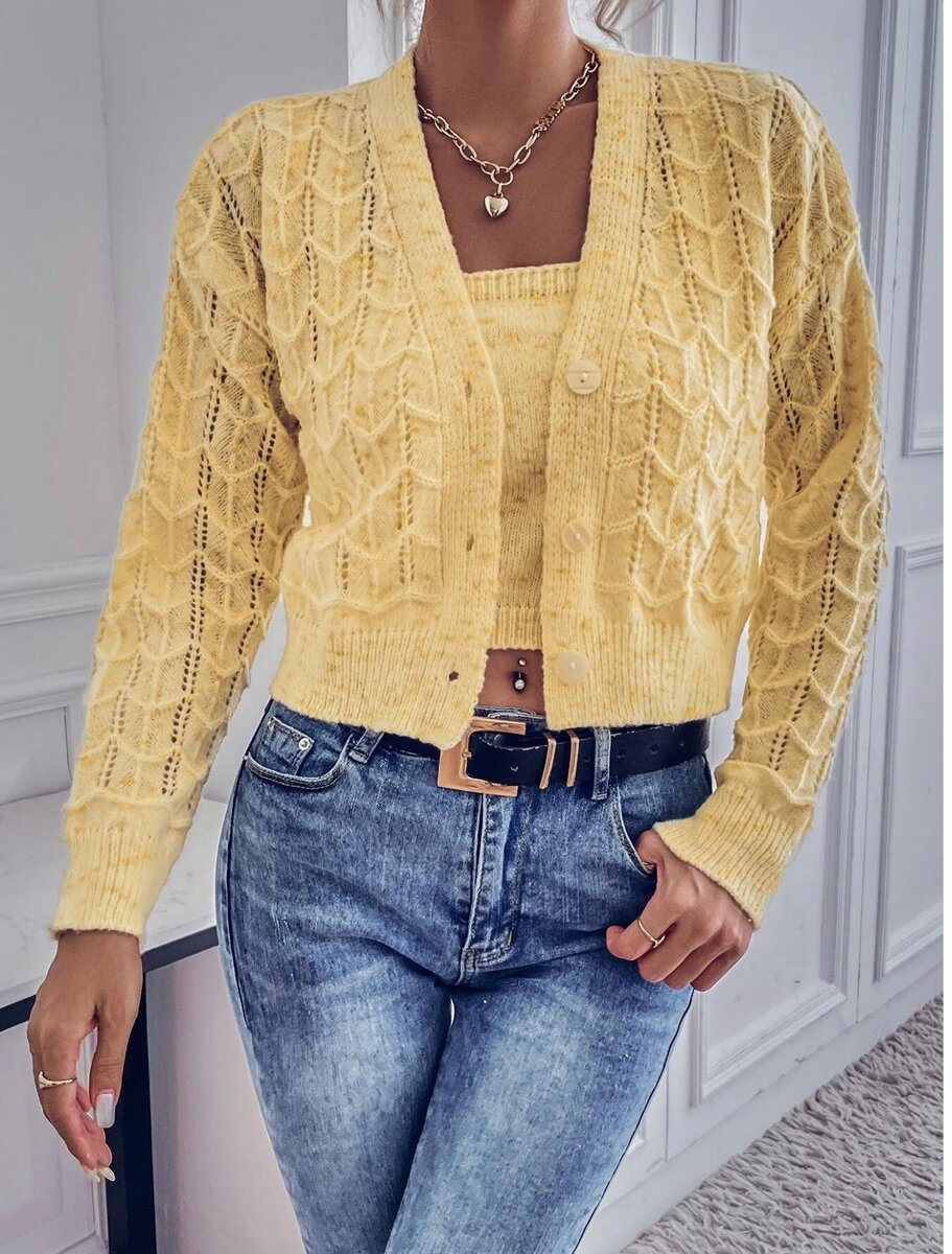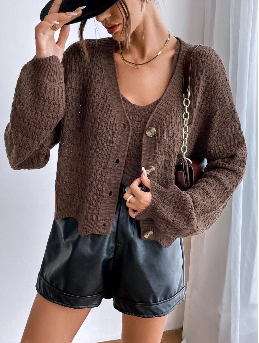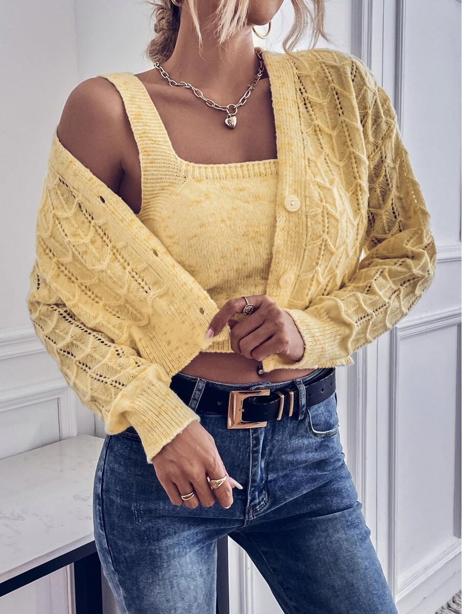 В этой двойке - классический кардиган и майка на тонких бретелях с V образным воротом.