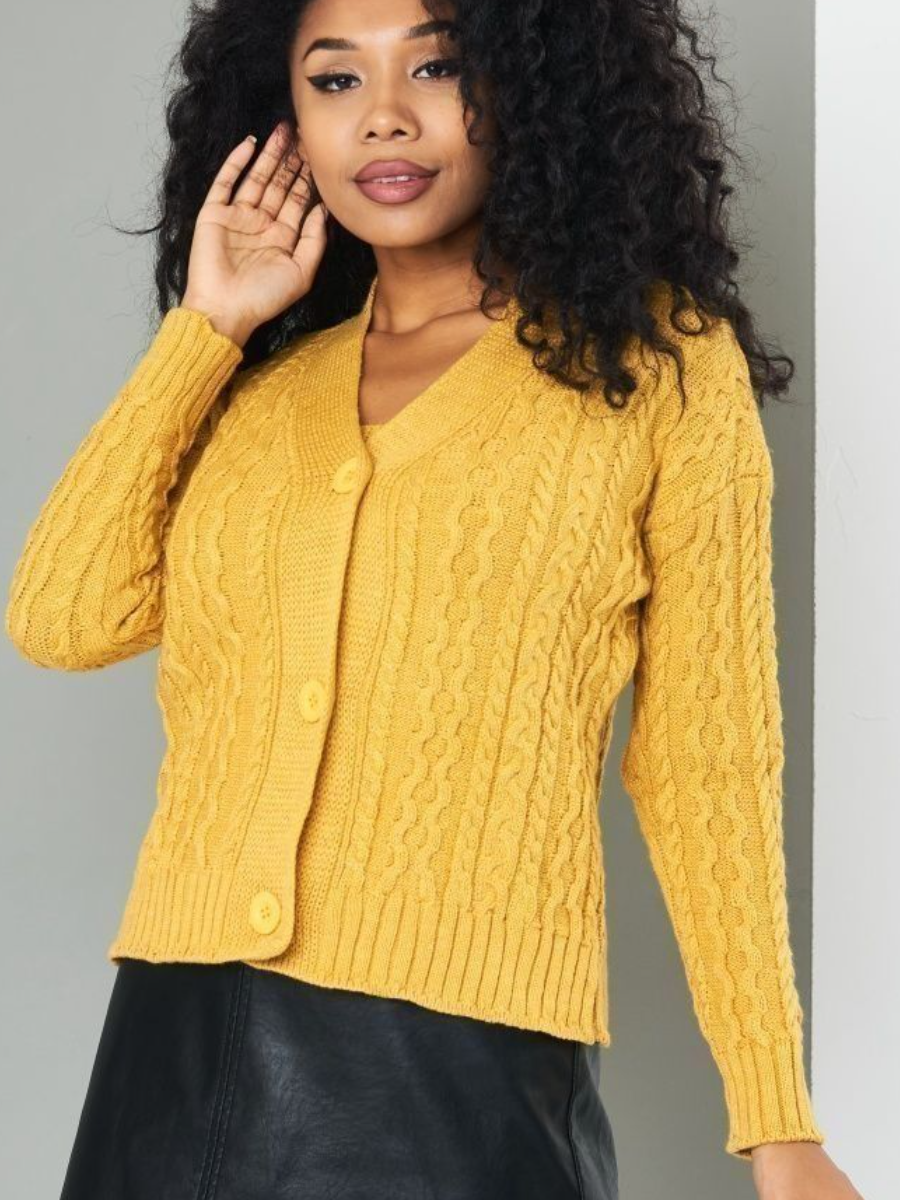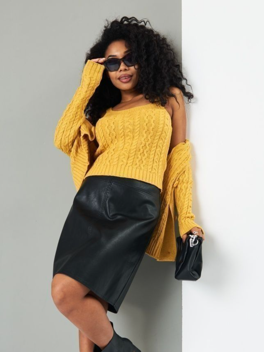 В этой двойке красиво все - очень насыщенный желтый (золотой) цвет, красивый женственный покрой. Узоры из кос очень удачно вписались в концепцию модели.