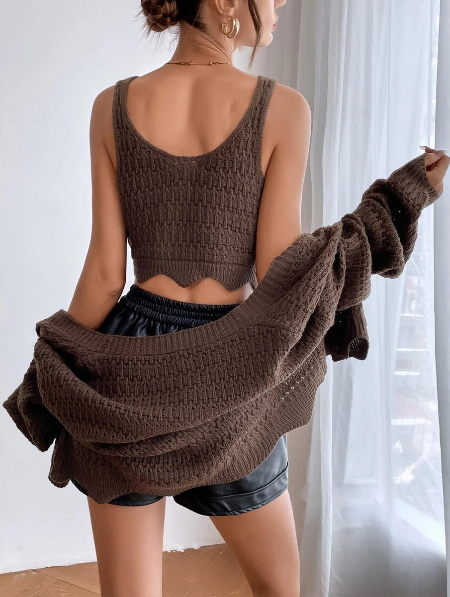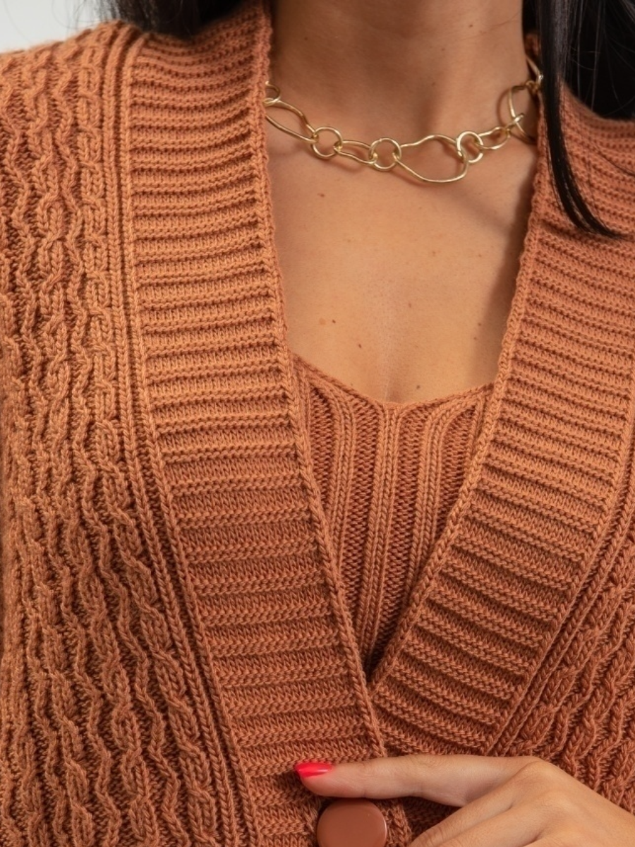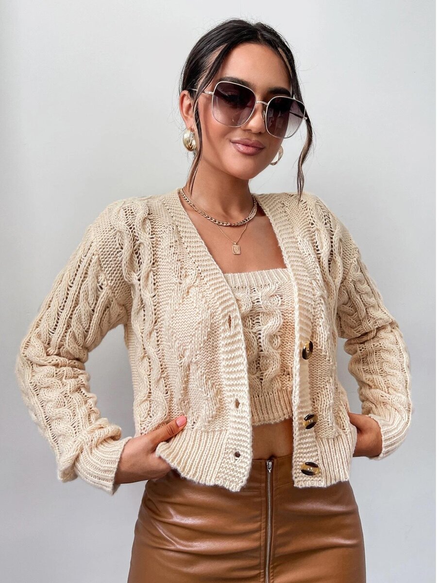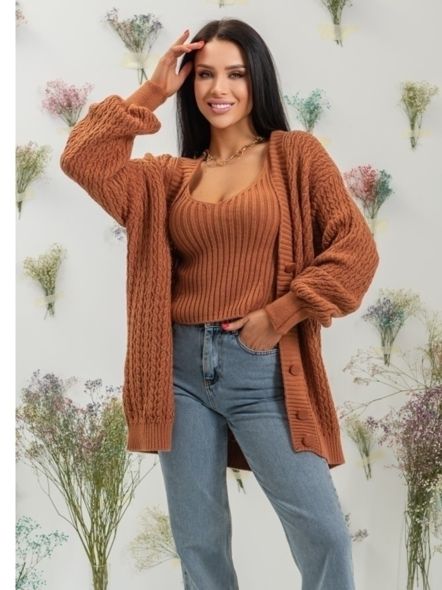 Кардиган в этой двойке стандартный, с V образным вырезом, спущенным плечом и застежкой на три крупные пуговицы. Все планки связаны резинкой 1х1. А вот модель топа скрыта (он не продается). Видно, что это топ на бретелях либо майка (безрукавка) с квадратным вырезом.
