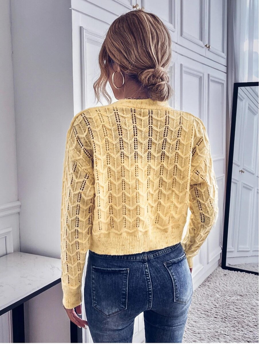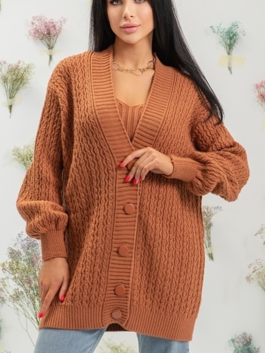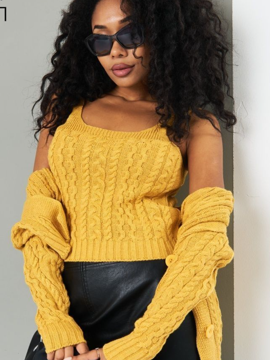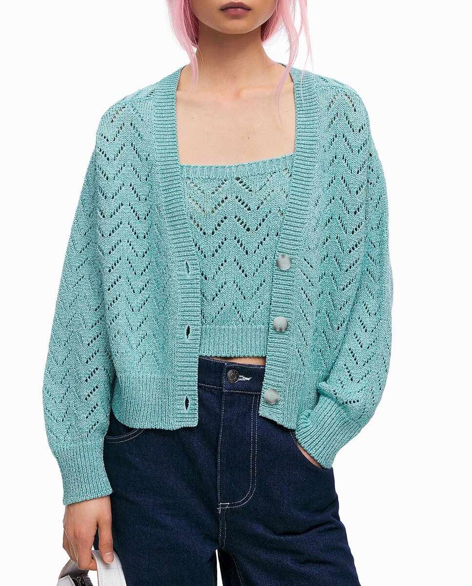 Кардиган в этой двойке стандартный, с V образным вырезом, спущенным плечом и застежкой на три крупные пуговицы. Все планки связаны резинкой 1х1. А вот модель топа скрыта (он не продается). Видно, что это топ на бретелях либо майка (безрукавка) с квадратным вырезом.