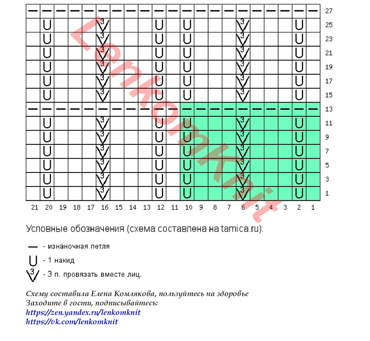Топ и кардиган связаны одинаковым узором, на рисунке - схема для нечетных лицевых рядов. Раппорт этого узора - 13 петель в ширину и 10 рядов в высоту, он выделен на схеме зеленым цветом.