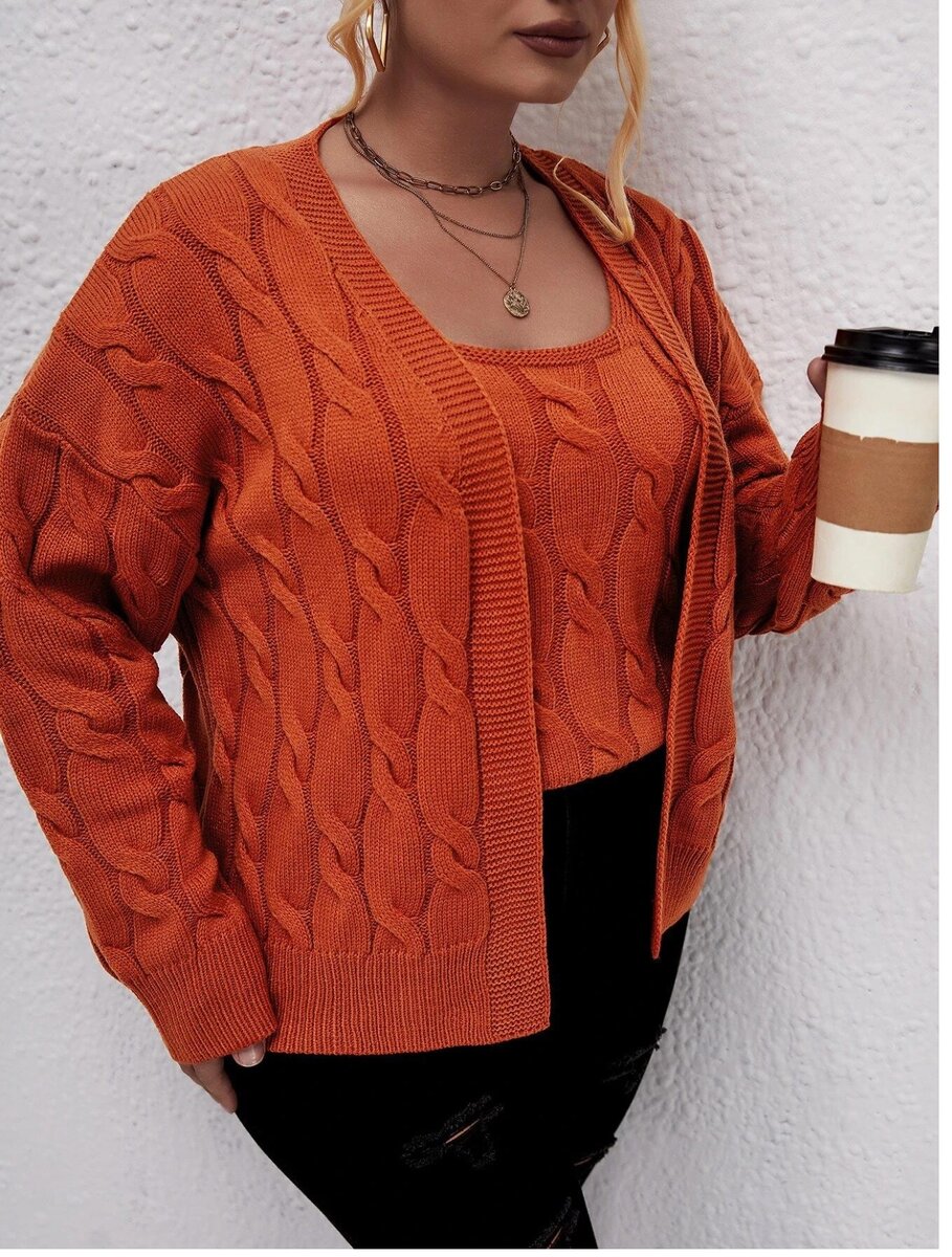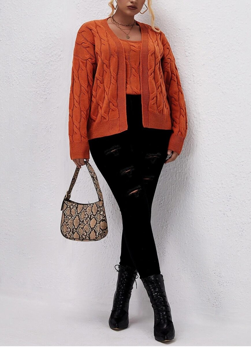 Следующая двойка - из каталога для пышных дам. Топ отдельно на фотографиях не показан. Думаю, это безрукавка с воротом квадратной формы. Застежки у этого кардигана нет.