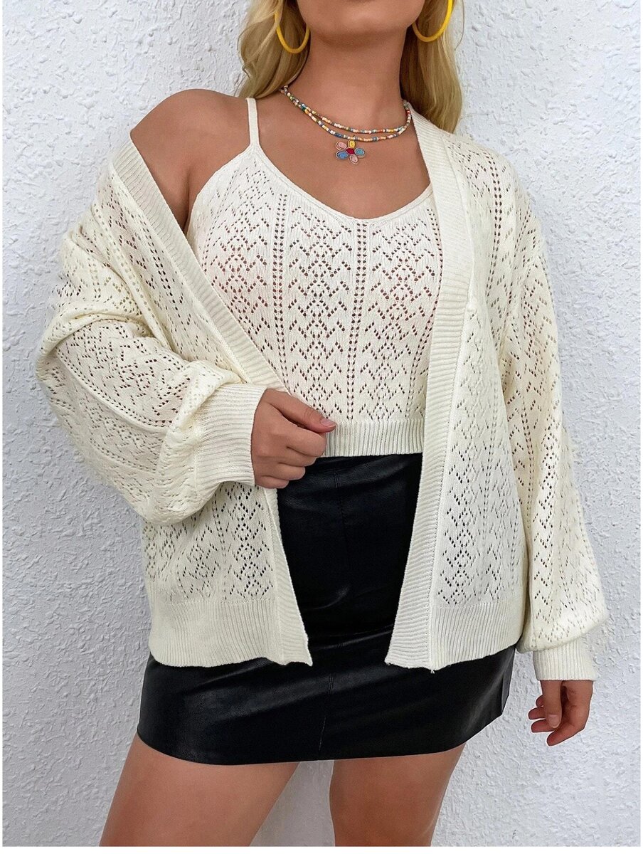 Эта двойка выполнена из пряжи белого цвета мелким ажурным узором. В ней мне нравится сочетание удлиненного широкого кардигана и укороченного облегающего топа. А не нравится, что у топа слишком тоненькие бельевые бретели (будет видно нижнее белье, а без него с таким размером груди ходить сложно). Я бы в этой двойке связала полноценную майку с широкими бретелями.