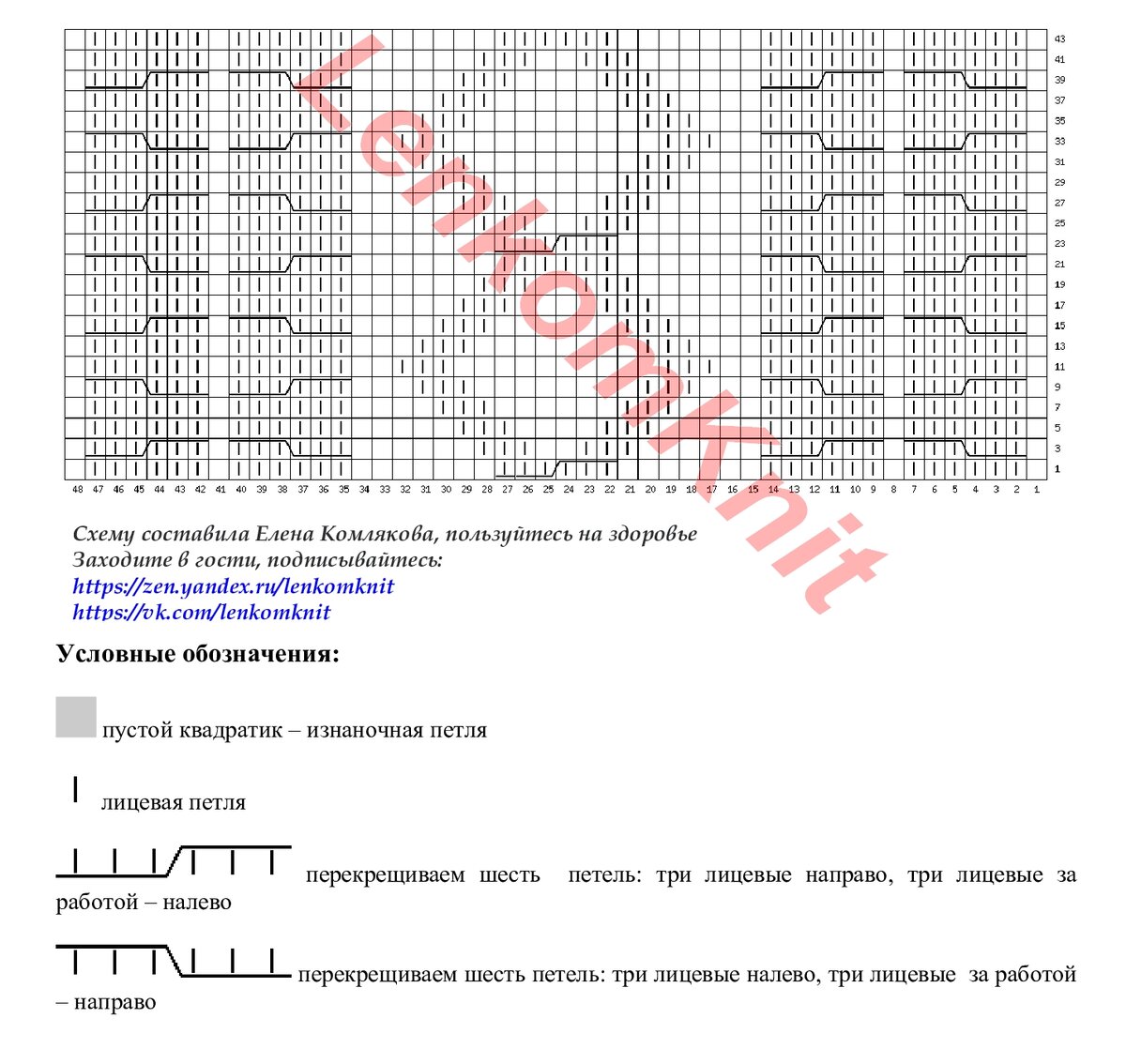 Схема узора для этой двойки (центр топа) - на рисунке. Справа и слева от крайних кос из шести петель повторяется узор, который в центре схемы.