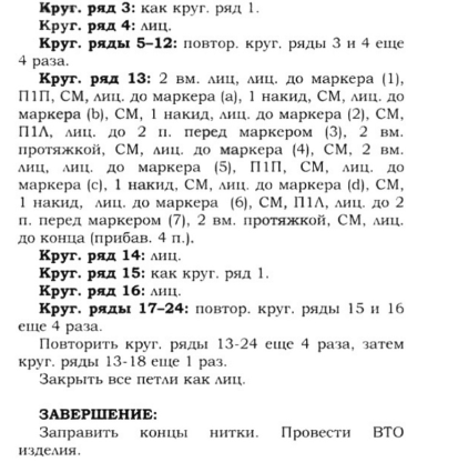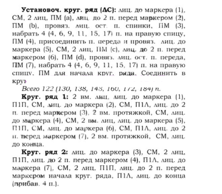 Установочный круговой ряд: 7 (7, 8, 8, 8, 9, 9) лицевых, поставить маркер 1 (ПМ1), 16 (18, 18, 18, 19, 19, 21) лицевых, ПМ2, 7 (7, 8, 8, 8, 9, 9) лицевых, ПМ3, 29 (30, 33, 33, 33, 34, 34) лицевых, ПМ4, 7 (7, 8, 8, 8, 9, 9) лицевых, ПМ5, 16 (18, 18, 18, 19, 19, 21) лицевых, ПМ6, 7 (7, 8, 8, 8, 9, 9) лицевых, ПМ7, 29 (30, 33, 33, 33, 34, 34) лицевых.