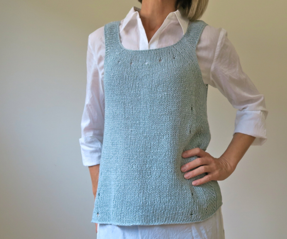 Присмотритесь к модели: она не так проста, как показалась сначала. Майка связана сверху вниз в технике реглан. Отсюда и такие интересные лямки, и узор из наклонных рядов, словно рамкой, обрамляющий лицевую гладь переда и спинки!