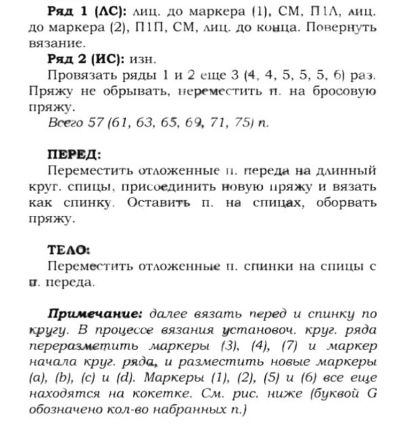 Круговой ряд 9 (прибавления и накиды для спинки и переда): вязать лицевыми до маркера 1, снять маркер на левую спицу, П1Л, 3 (4, 4, 4, 2, 2, 3) лиц., *накид, 5 лиц., повторять от * ещё 3 (3, 3, 3, 4, 4, 4) раза, накид, вязать лицевыми до маркера 2, П1П, снять маркер на левую спицу, вязать лицевыми до маркера 3, снять маркер на левую спицу, вязать лицевыми до маркера 4, снять маркер на левую спицу, вязать лиц. до маркера 5, снять маркер на левую спицу, П1Л, 3 (4, 4, 4, 2, 2, 3) лицевых, **1 накид, 5 лицевых, повторить от ** ещё 3 (3, 3, 3, 4, 4, 4,) раза, 1 накид, вязать лицевыми до маркера 6, П1П, снять маркер на левую спицу, вязать лицевыми до маркера нач. ряда = всего по 33 (35, 35, 35, 37, 37, 39) п. для переда и спинки.