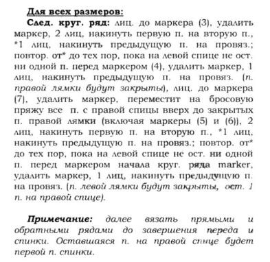 Круговой ряд 3 (прибавления для спинки, переда и лямок): вязать лицевыми до маркера 1, снять маркер на левую спицу, П1Л, вязать лицевыми до маркера 2, П1П, снять маркер на левую спицу, вязать лицевыми до маркера 3, снять маркер на левую спицу, П1Л, вязать лицевыми до маркера 4, П1П, снять маркер на левую спицу, вязать лицевыми до маркера 5, снять маркер на левую спицу, П1Л, вязать лицевыми до маркера 6, П1П, снять маркер на левую спицу, вязать лицевыми до маркера 7, снять маркер на левую спицу, П1Л, вязать лицевыми до маркера нач. ряда = прибавлено 8 петель.