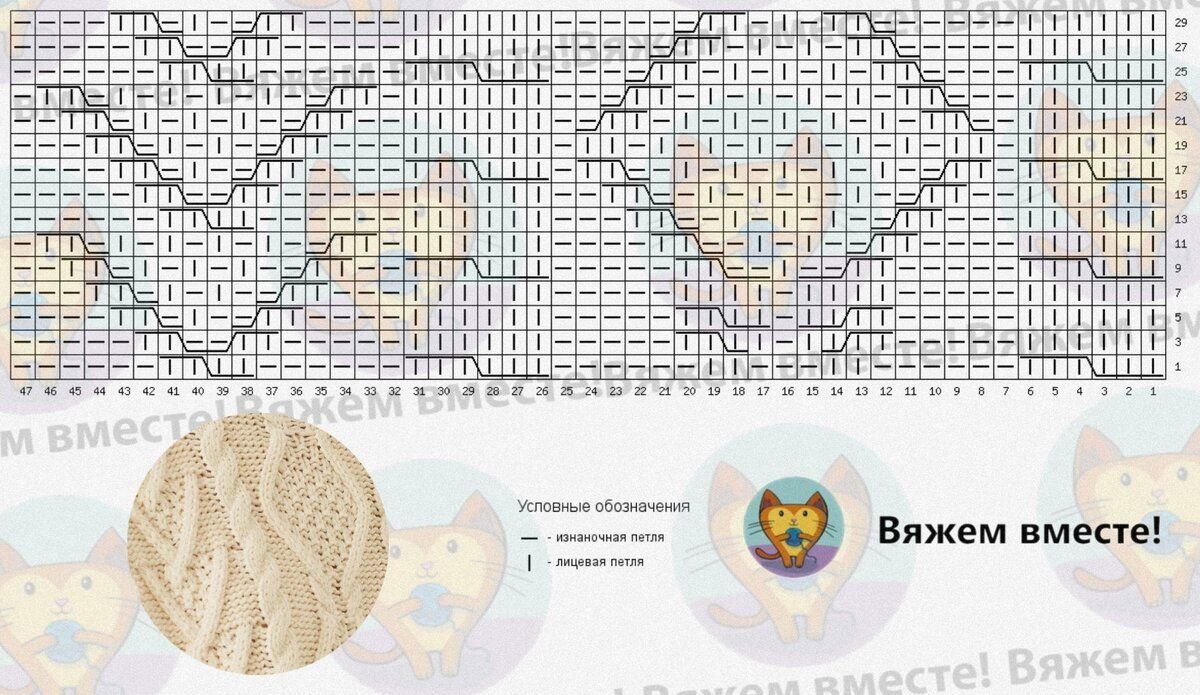 Примерную схему для вязания узора добавила ниже. По краям деталей вдобавок вяжется коса с асимметричными переплетениями.