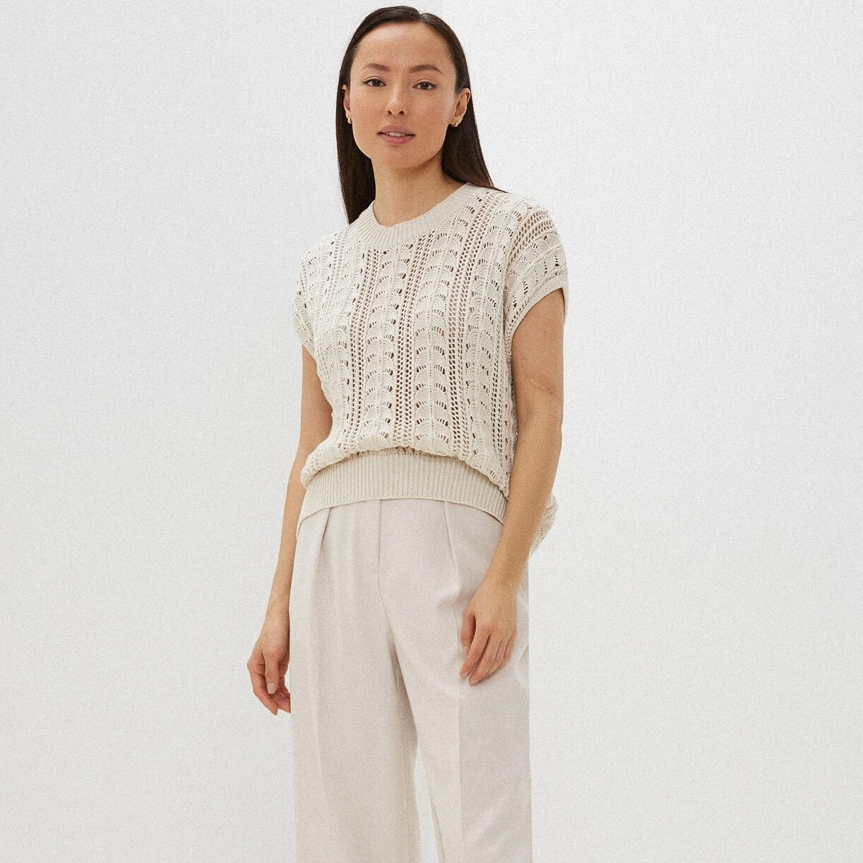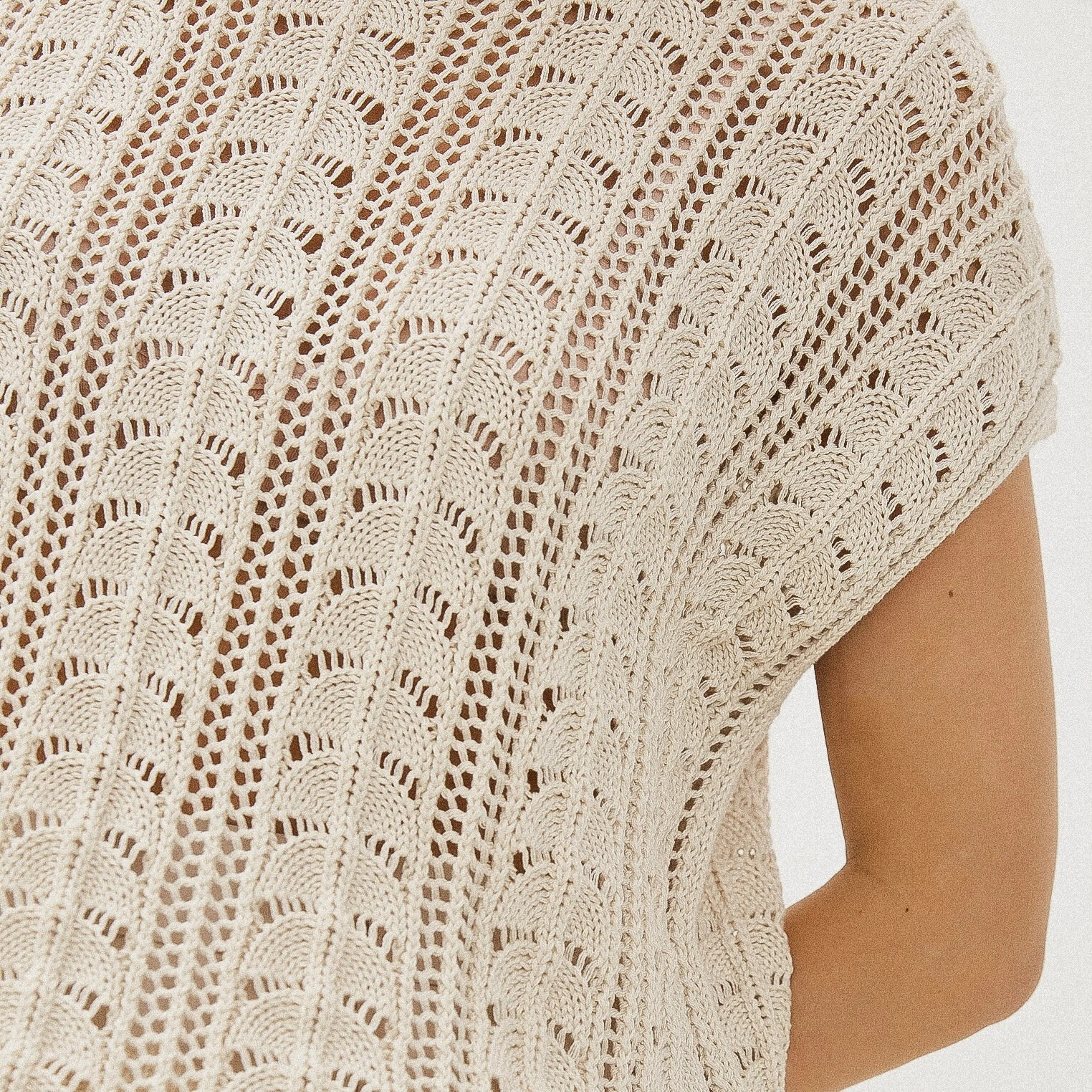 Сочетанием ажурных узоров данная модель напоминает известную в кругах рукодельниц безрукавку от Брунелло Кучинелли. Хотя узор там иной, а пряжа и спицы на несколько порядков толще.