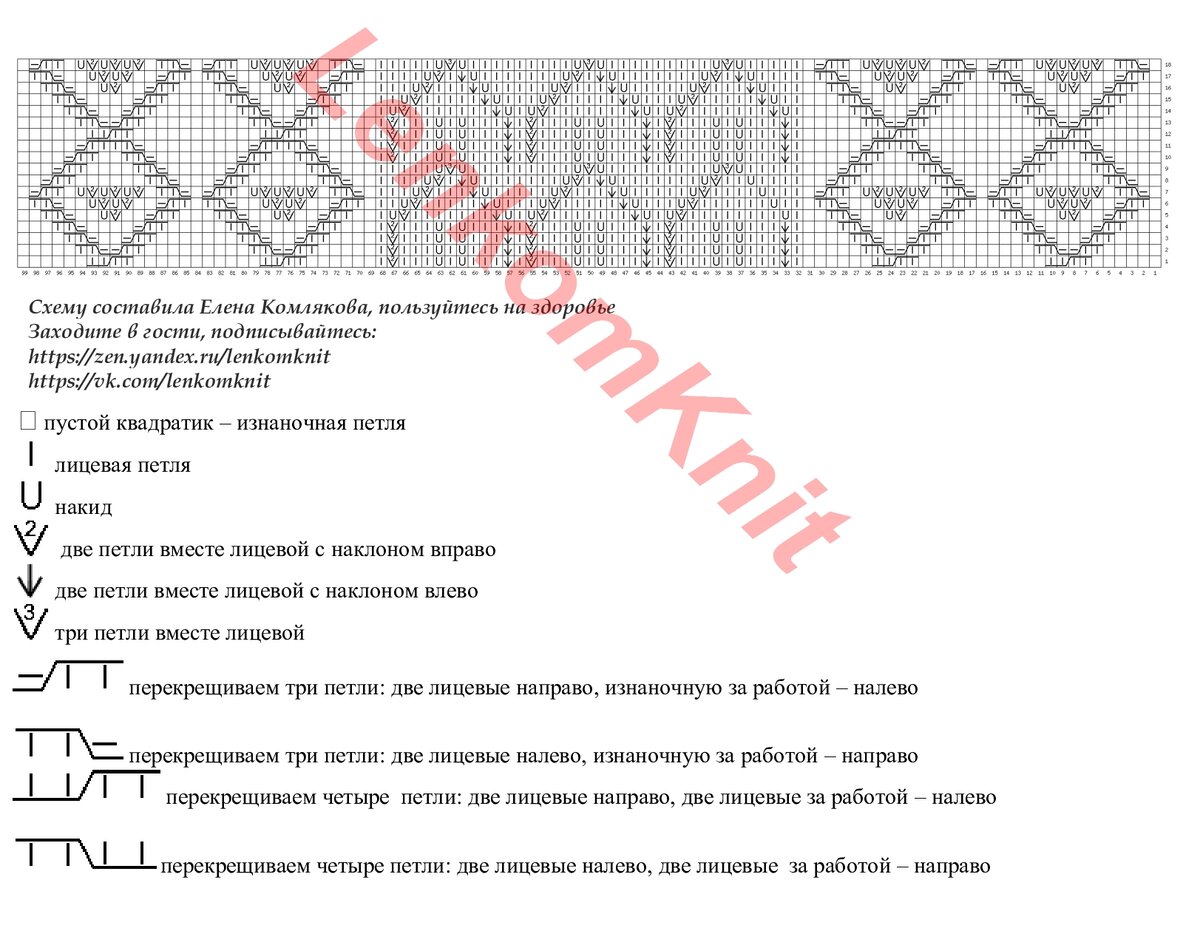 Справа и слева от ромбов недостающее количество петель вяжем ажурным узором (который в центре)
