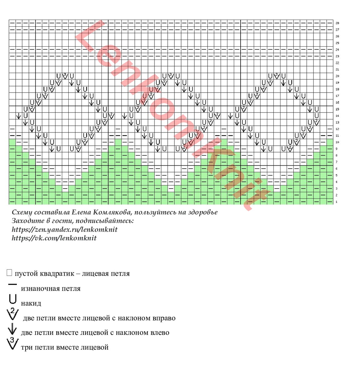 Для джемпера я составила две схемы. Первая - это нижняя часть. В этой схеме и лицевые, и изнаночные ряды (ажурные ромбы вывязываются в каждом ряду). Зеленым цветом я для удобства отметила участки, которые вяжутся жемчужным узором.
