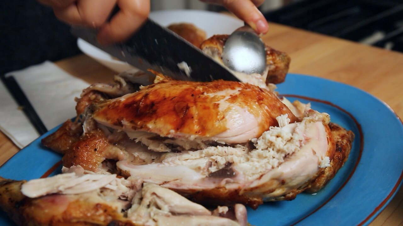 Промойте курицу снаружи и внутри холодной водой. Промокните ее бумажными полотенцами, а затем отрежьте лишний жир.